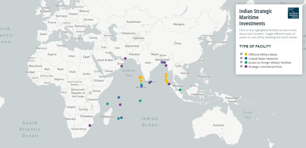 The maritime strategy of India as outlined by its navy in 2007 under the title “Freedom to Use the Seas: India’s Maritime Military Strategy” clearly boasts the ambitions of India in establishing a variety of military installations along the contours of this vast ocean. Over the next decade, it has achieved its stated aims by acquiring bases and listening posts in regions overseeing entry and exit points of Indian ocean. With the increased economic size, China started to wield its power through investment initiatives which brought countries under its zone of influence. Although the Chinese built ports are located in strategic locations, considering the reality, the ports in Sri Lanka, Pakistan, and Myanmar do not carry military significance for China as yet.